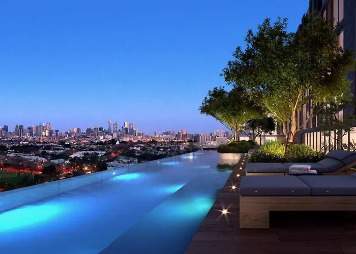 Waar vind ik Luxe Flemington Cityscape Racecourse Views Pool Gym Parking appartement?